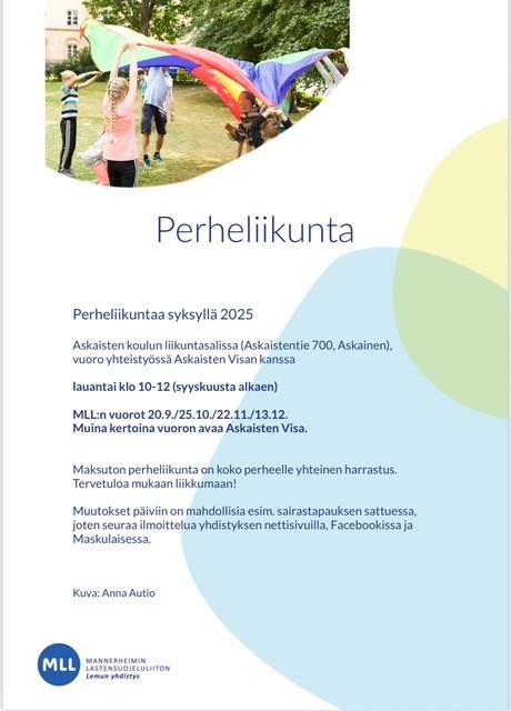 Maksuton perheliikunta on koko perheelle yhteinen harrastus. Perheliikuntakerrat ovat avoimet omatoimiseen liikkumiseen tarkoitettuja. Kerroilla ei ole lastenhoitoa, joten oma aikuinen tulee olla lasten kanssa liikkumassa. Perheliikunnassa on paikalla MLL:n vapaaehtoinen ja erilaisia liikuntavälineitä.